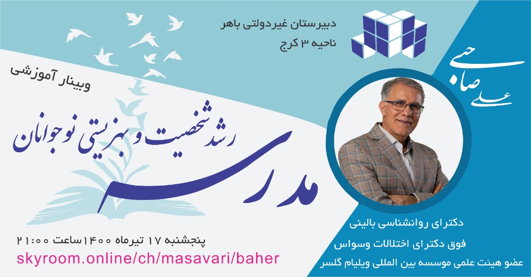 روز پنجشنبه ۱۷ تیر ۱۴۰۰ ساعت 21:00 الی 22:30 وبینار آموزشی ویژه والدین گرامی با موضوع (مدرسه ، رشد شخصیت بهزیستی نوجوانان)